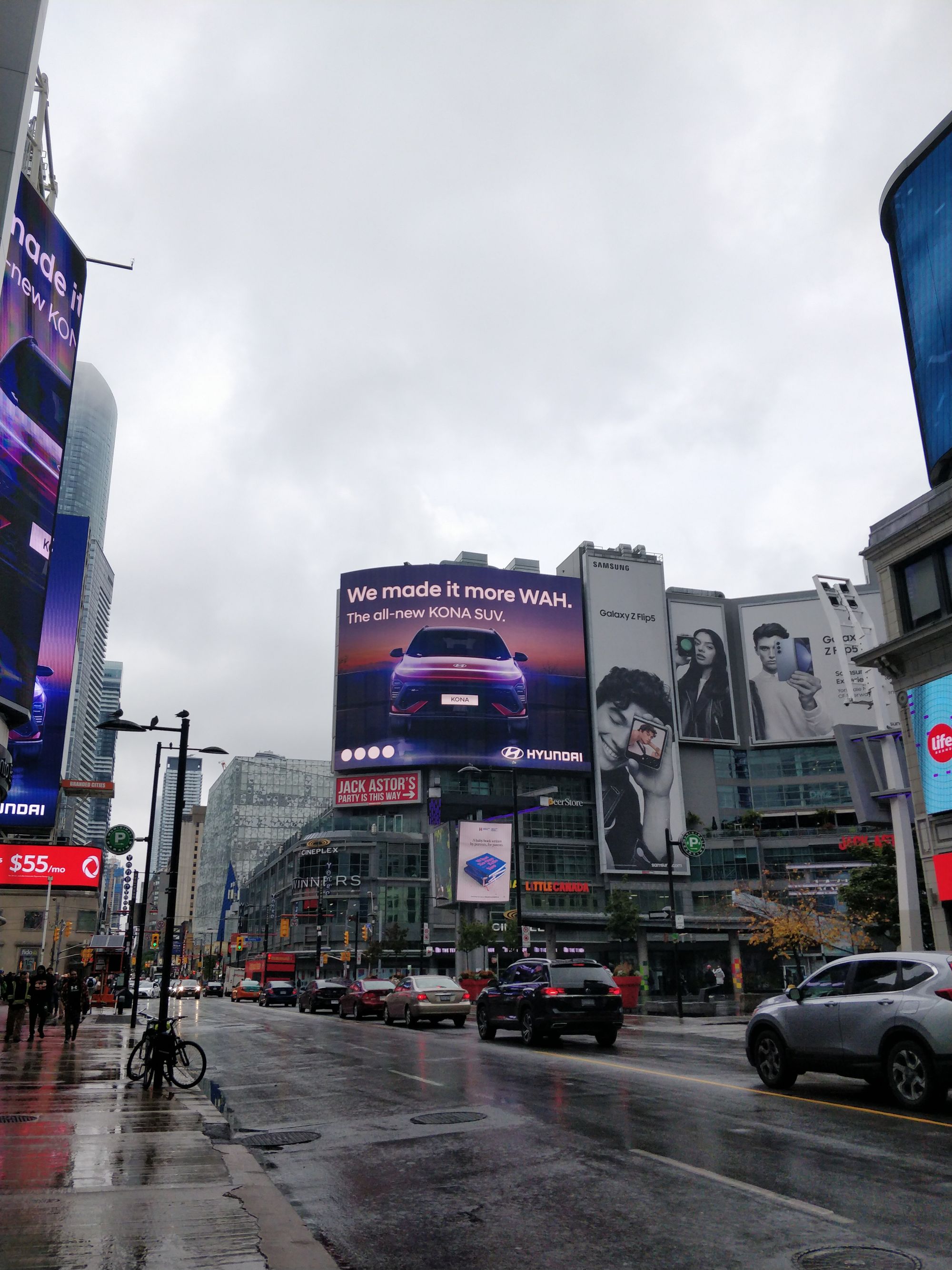 Arrivé·e·s dans la ville, on s'est garé·e·s dans le centre (quelle erreur, conduire dans le centre de Toronto a été un enfer), donc on a commencé par le quartier business avec les gros buildings. Yonge-Dundas Square, c'est une place très commerciale avec des écrans de publicité partout, un peu l'équivalent de Times Square mais version Wish.