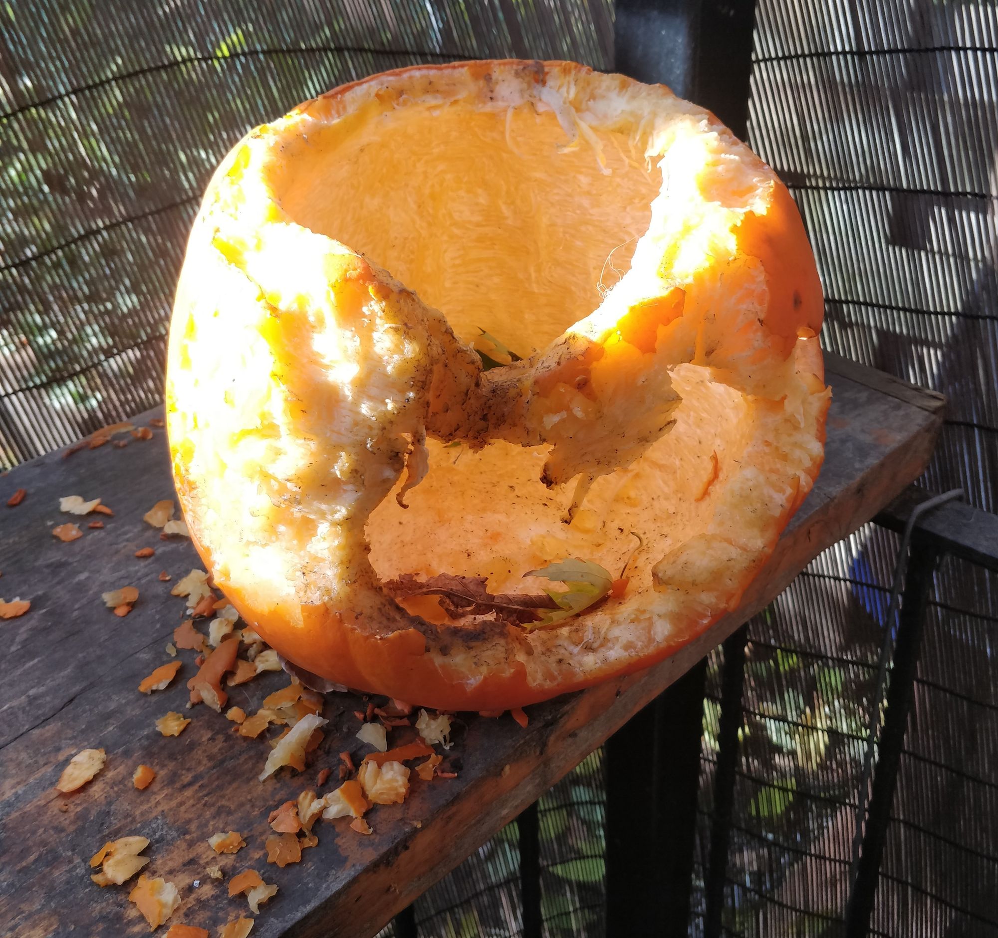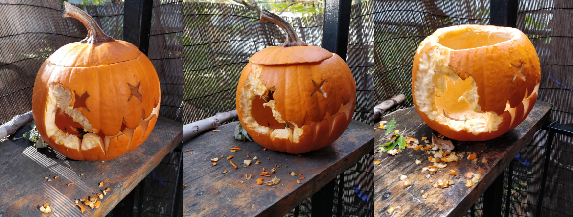 Et pour la citrouille, on a décidé de lui donner un air un peu méchant avec une bouche machiavélique et des yeux en croix. Honnêtement, la partie la plus longue c'était vraiment de la vider. Et l'odeur est vraiment pas alléchante... La peau est moins dure que ce que je pensais, donc lorsqu'il a fallu lui faire un visage, ça a été plus simple que prévu !
